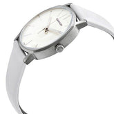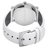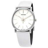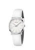 Elegante Quarzuhr von Calvin Klein mit 32-mm-Edelstahlgehäuse und klassischem weißem Zifferblatt. Das Schweizer ETA-Kaliber F05.101 Quarzwerk sorgt für präzise Zeitmessung, während das kratzfeste Mineralglas das Zifferblatt schützt. Das weiße Lederarmband mit Dornschließe bietet komfortablen Tragekomfort. Mit silberfarbenen Leuchtzeigern, wasserdicht bis 30 Meter und Swiss-Made-Qualität – ideal für alltägliche Eleganz und zeitlose Raffinesse.