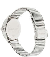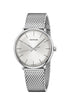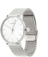 Edelstahlgehäuse mit Edelstahl-Mesh-Armband. Feste Edelstahl-Lünette. Silbernes Zifferblatt mit silberfarbenen Leuchtzeigern und Index-Stundenmarkierungen. Minutenmarkierungen am Außenrand. Zifferblattart: Analog. Leuchtzeiger. Quarzwerk. Kratzfestes Mineralglas. Zug-/Druckkrone. Massiver Gehäuseboden. Runde Gehäuseform. Gehäusegröße: 40 mm. Gehäusedicke: 7 mm. Bandbreite: 20 mm. Faltschließe. Wasserdicht bis 30 Meter / 100 Fuß. Funktionen: Stunde, Minute, Sekunde. Lässiger Uhrenstil. Uhrenlabel: Swiss Made. Calvin Klein High Noon Quarz-Herrenuhr mit silbernem Zifferblatt K8M21126.