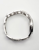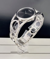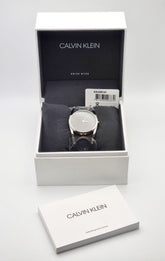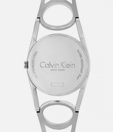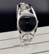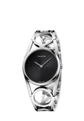 Elegante Damenuhr von Calvin Klein mit Edelstahlgehäuse und passendem Armband, gesichert durch eine hochwertige Schmuckschließe. Das 32,50 mm große Gehäuse präsentiert ein klassisches schwarzes Zifferblatt mit silberfarbenen Zeigern und analoger Anzeige – ein zeitloses Design für anspruchsvolle Träger. Das kratzfeste Mineralglas schützt das Zifferblatt zuverlässig. Mit präzisem ETA-Quarzwerk und Wasserdichtigkeit bis 30 Meter ideal für den alltäglichen Gebrauch. Die Armband-Innenlänge von 16,5 cm bietet optimale Passform. Schweizer Herstellung, geliefert in Originalverpackung.