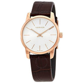 Diese elegante Calvin Klein Damenuhr verbindet zeitlose Ästhetik mit zuverlässiger Funktionalität. Das roségoldene PVD-Stahlgehäuse (31 mm) wird von einem klassischen braunen Lederband ergänzt und präsentiert ein silbernes Zifferblatt mit roségoldenen Zeigern. Das kratzfeste Mineralglas schützt das analoge Quarzwerk, während die 30-Meter-Wasserdichtigkeit alltägliche Feuchtigkeitseinflüsse abhält. Die feste roségoldene Lünette und der solide Gehäuseboden unterstreichen die hochwertige Verarbeitung. Mit einer Gehäusestärke von nur 7 mm sitzt die Uhr angenehm am Handgelenk. Perfekt für den modernen, anspruchsvollen Alltag. Inklusive Original Calvin Klein Verpackung.