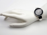 Elegante Damenuhr von Calvin Klein mit klassischem Design und hochwertiger Verarbeitung. Das Gehäuse und Armband bestehen aus poliertem Edelstahl, ergänzt durch eine feste Edelstahllünette. Das schwarze Zifferblatt mit silbernen Zeigern präsentiert sich zeitlos und minimalistisch. Das kratzfeste Mineralglas schützt das Zifferblatt zuverlässig. Mit Quarzwerk und analoger Anzeige bietet die Uhr präzise Zeitmessung. Die runde Gehäuseform mit 38 mm Durchmesser und 11 mm Dicke sitzt elegant am Handgelenk. Das 18 mm breite Armband wird durch eine robuste Schmuckschließe gesichert. Die Wasserdichtigkeit bis 30 Meter macht sie alltagstauglich. Schweizer Herstellung garantiert Qualität und Zuverlässigkeit.